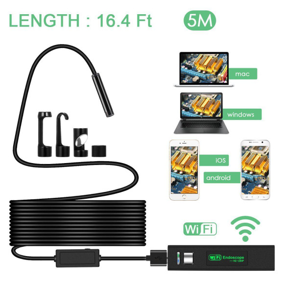 Эндоскоп WiFi 1280*720 HD 5м жесткий кабель водонепроницаемый 8 LED IP67